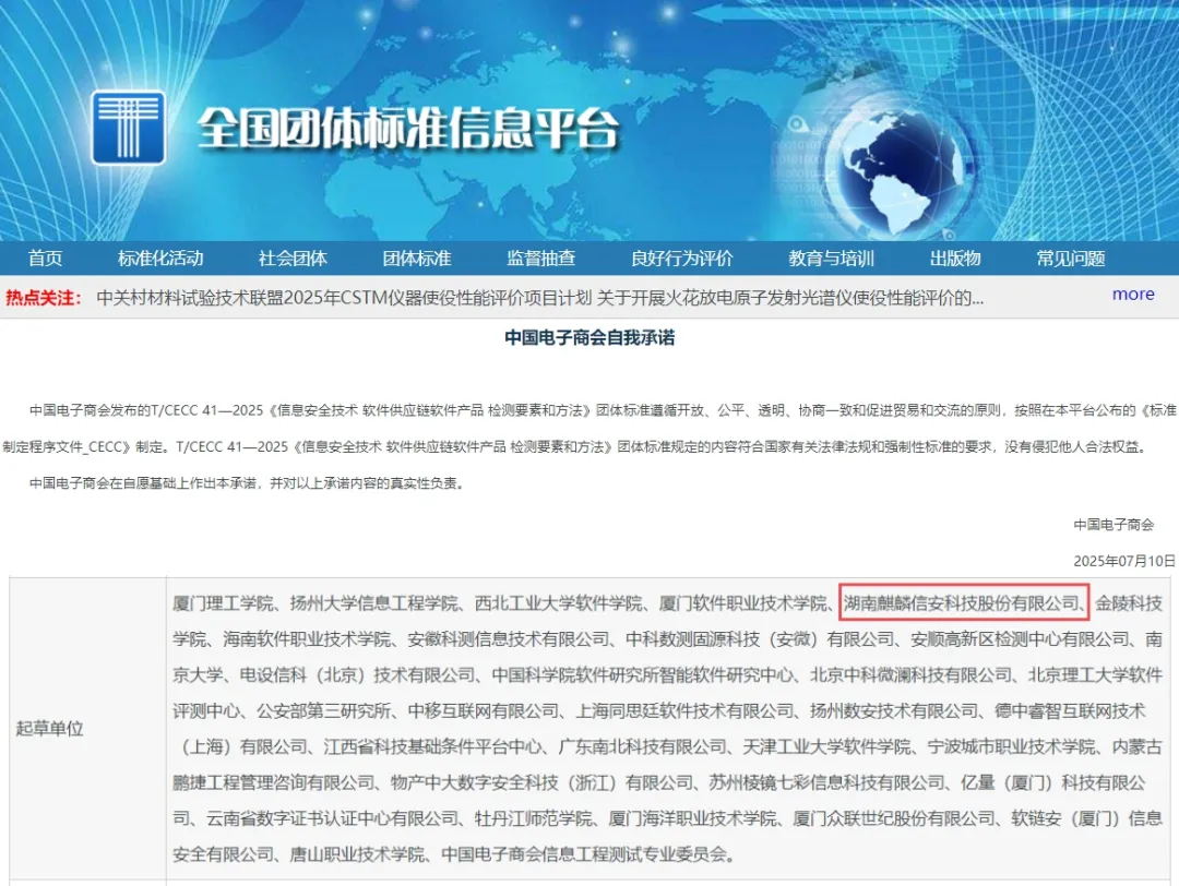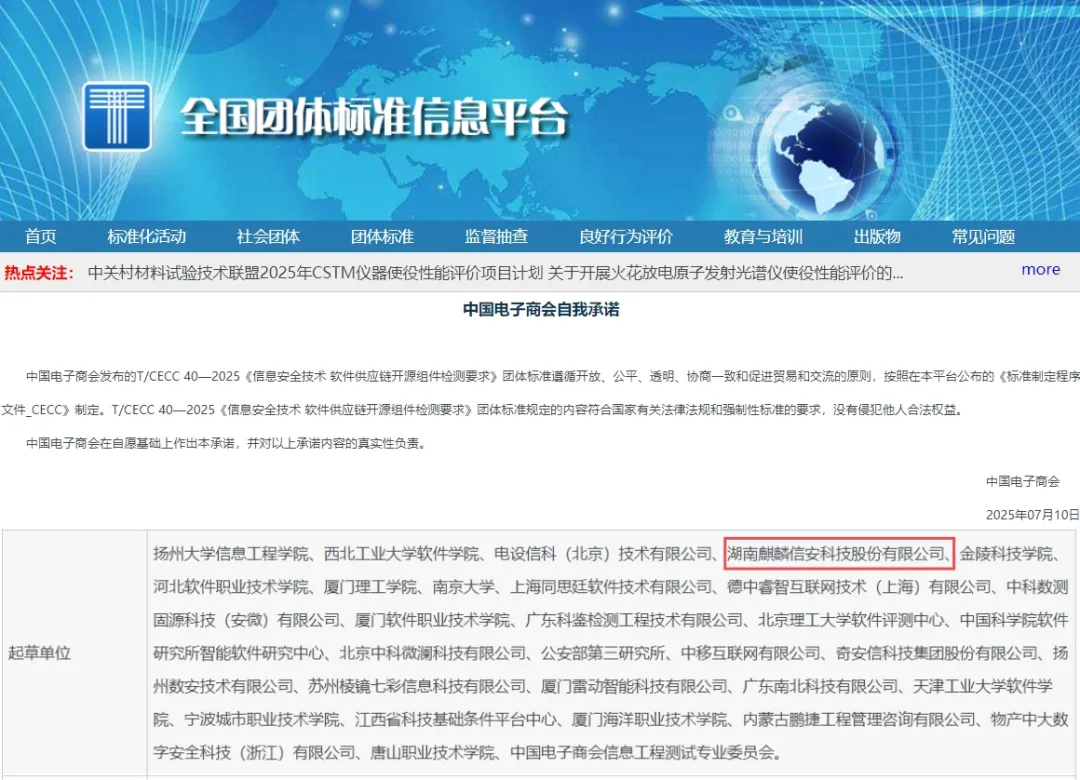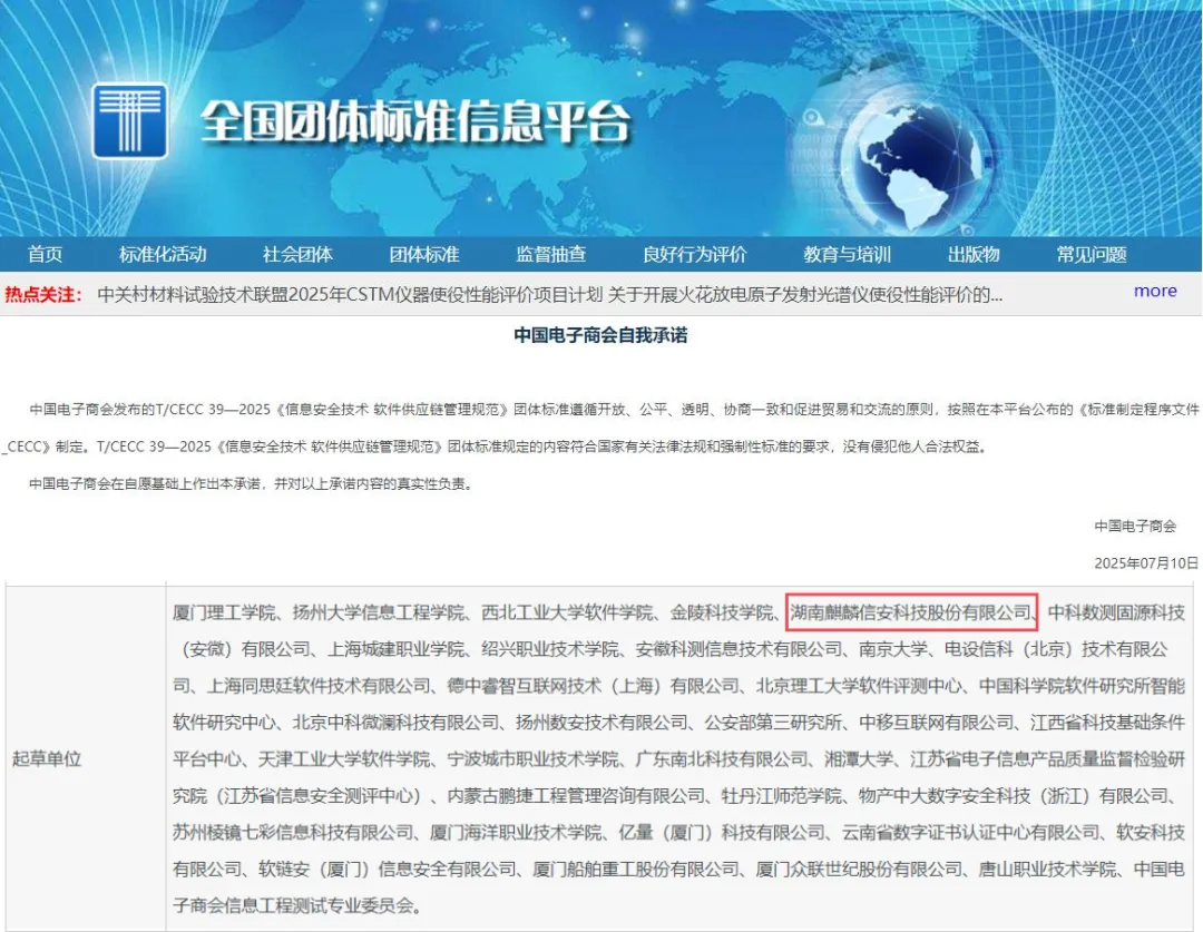日前,由中国电子商会正式发布了T/CECC 39—2025《信息安全技术 软件供应链管理规范》、T/CECC 40—2025《信息安全技术 软件供应链开源组件检测要求》以及 T/CECC 41—2025《信息安全技术 软件供应链软件产品检测要素和方法》三项重要团体标准。麒麟信安结合自身在软件供应链安全领域的实践经验,作为主要参编单位之一,深入参与标准内容的研讨与编制工作,确保其既能满足行业实际需求,又具备广泛的适用性和前瞻性,为软件供应链安全发展提供了有力的实践指导。