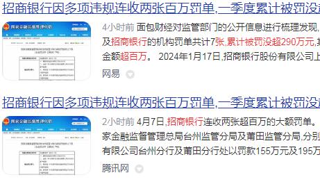 2024年一季度累计被罚没超290万,2024年一季度,涉及招商银行的机构罚单共计7张,累计被罚没超290万元,其中有一张被罚没金额超百万。